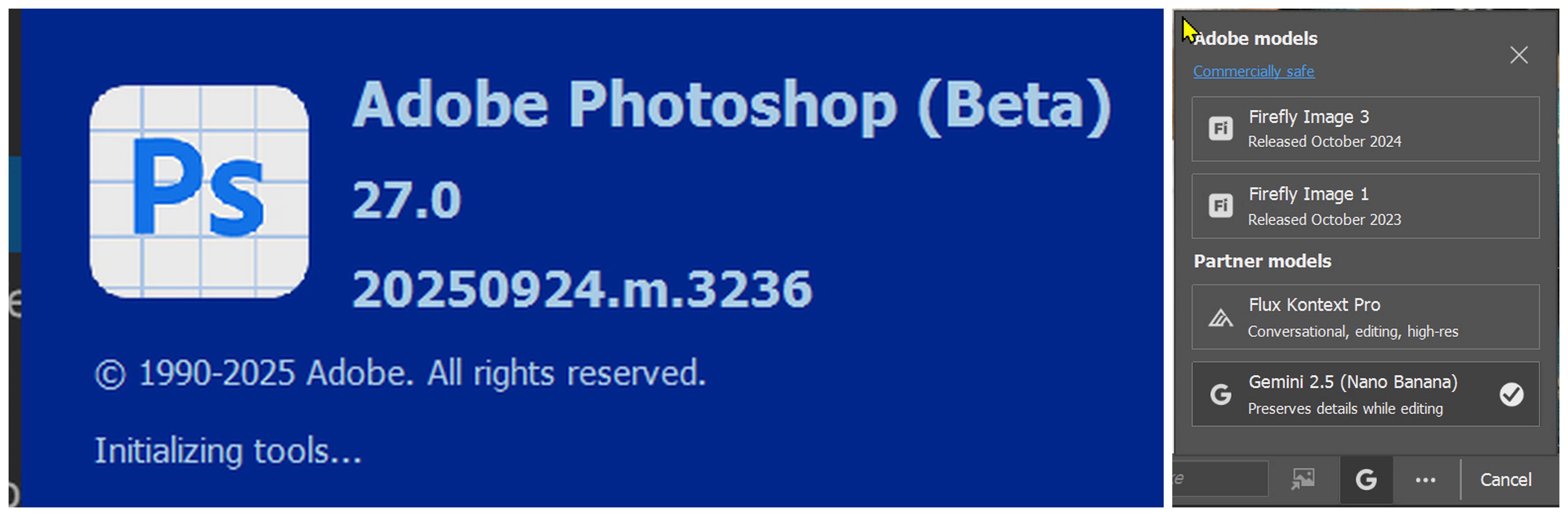 As of this morning's update (09/25/2025) to Photoshop Beta, I now have the two new partner models that includes Nano Banana.