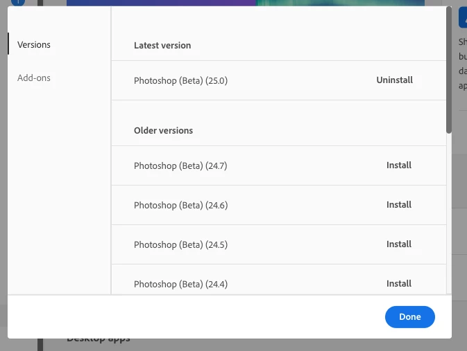 When trying to open groups/folders or move layers around they were stuck so I figured I should revert back to the v24.0 version but Adobe Creative Cloud doesn't give the option to roll back. Normally when you are on CC there should be three dots that open up to show "Other versions" but that's not available for Photoshop Beta.