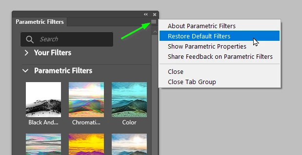 This seems to be an ongoing problem with Toolbar and Adjustment layer icons not showing, and now several people finding Parametric filters empty. It's persisted through several updates, but is inconsistant. You might find that simply restarting Photoshop fixes it for instance. Otherwise, all you can do is try the Restore link