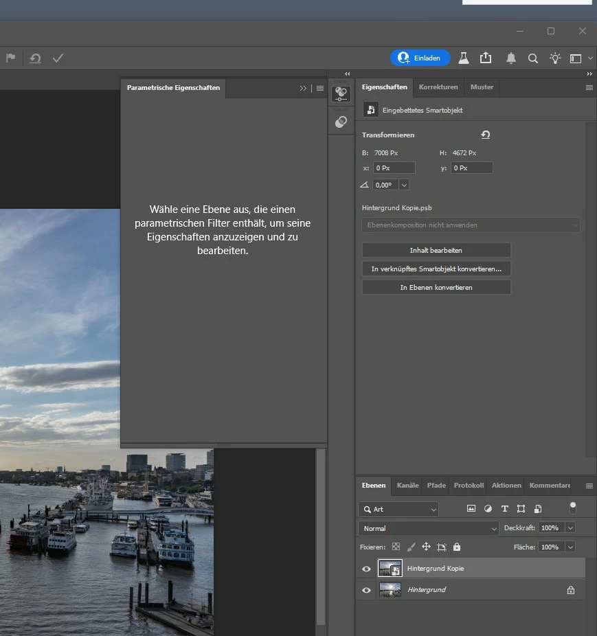 Nach aktivieren eines Parametrischen Filters wird eine smart filter Ebene teilweise erzeugt, die Eigenschaften lassen sich aber nicht bearbeiten. Siehe Screenshot:
