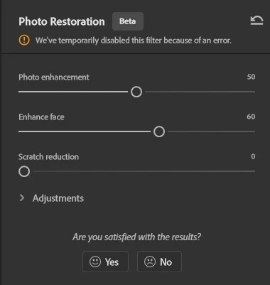 For the last couple of weeks I've noticed the photo restoration neural filter has been disabled. The notification says "We've temporarily disabled this filter because of an error." I tried running the filter, just in case, but true to its word, it was disabled. I enjoy restoring obscured and blurry faces with this feature, but I haven't been able to do it for a while now.