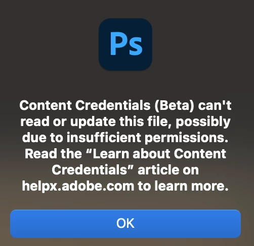 "Content Credentials (Beta) can't read or update this file, possibly due to insufficient permissions. Read the 'Learn about Content Credentials' article on helpx.adobe.com to learn more."