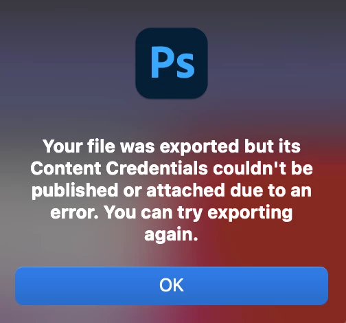 "Your file was exported but its Content Credentials couldn't be published or attached due to an error. You cant try exporting again."