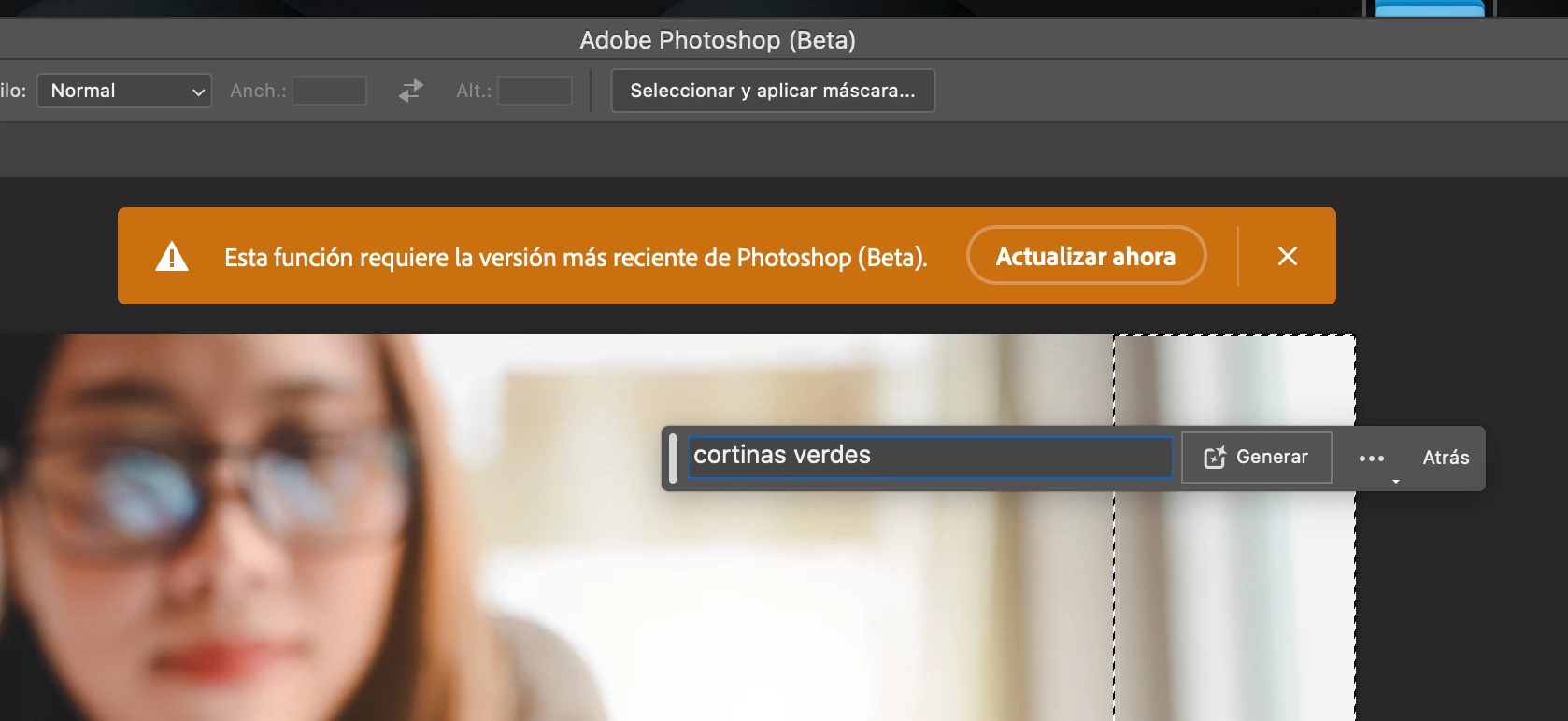 Instale hoy la versión de photoshop 24.7, al abrirla y querer usar el relleno generativo me dice que debo actualizar la versión... si ya tengo instalada la última versión a través de Creative Clound???? Ayuda por favor ya la he desinstalado e instalado varias veces y sigue el mismo error.
