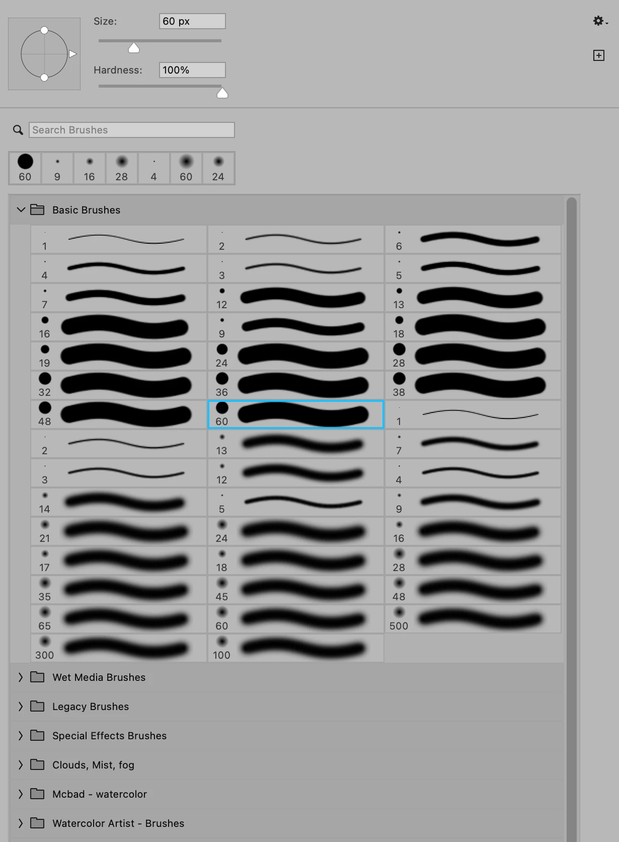 I like that palette because it displays the brushes I have been using and I can select one of those if I want to maintain size, style on the image I am working on. Does that make sense?