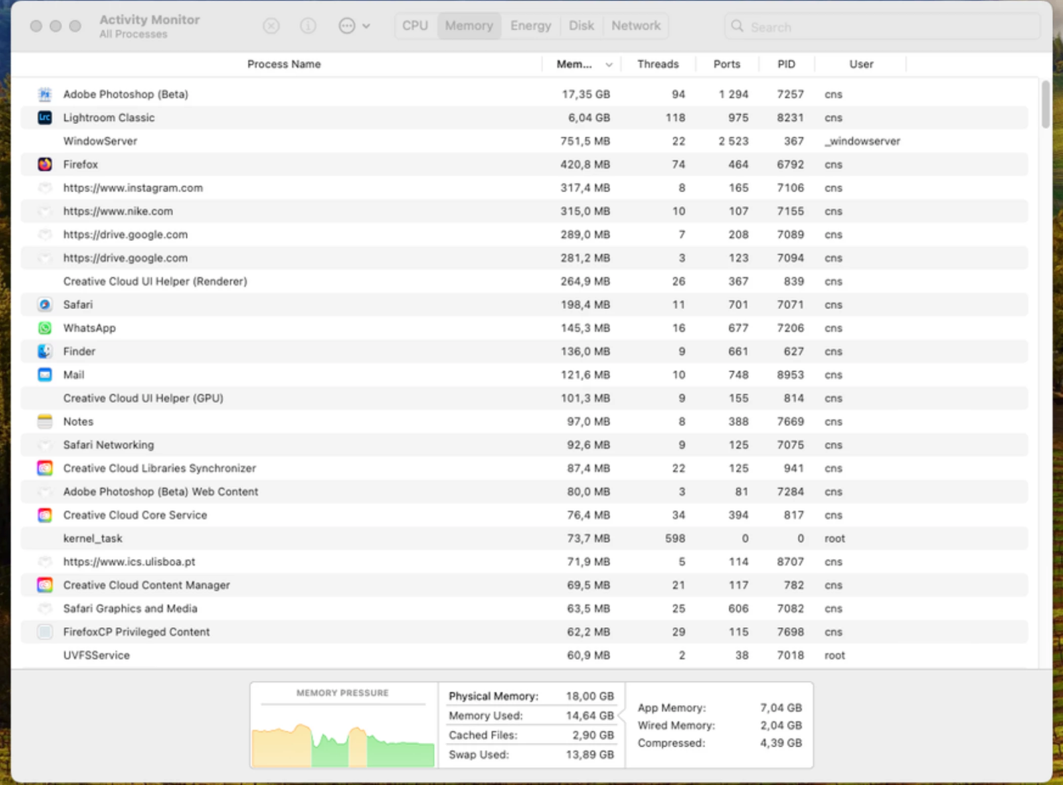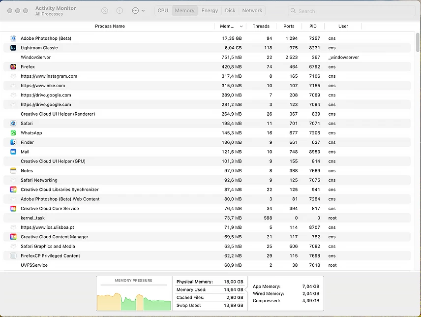 Olá , estou a trabalhar num novo macbook 18gb m3 , e o photoshop beta consome toda memoria ram mesmo não estando a trabalhar com o photoshop , estou no lightroom , o mac fica muito lento por incrivel que possa parecer