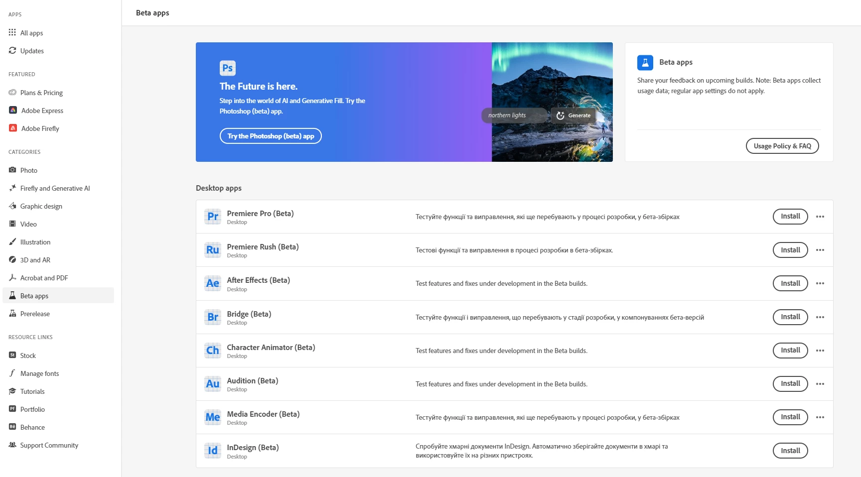 At this time, when the update released, I didn't install it. Clearly because of what I said before. But 2 days ago I decided to do it end appeared the error (190) that unable me to update it. I updated my Windows 10 and after that Photoshop (Beta) update works. After update, I start my Photoshop (Beta) and encountered with that kind of not pleasant issue again (if say it without swears). So what the problem is: When I start generation fill, it began processing and ends at the very start without any changing. I'm already followed the steps “Completely delete all apps and CC then install it again” several times. But after that it's not only did not help, it made all worst. Photoshop (Beta) disappeared from my “Beta apps list” and now I'm not even able to download it. I don't know helps it or not, but what interesting is that I have this ad (look at screenshot) that offers me to "try the photoshop (beta) app". But when I click on it, anything doesn't happens. I don't know what to do.