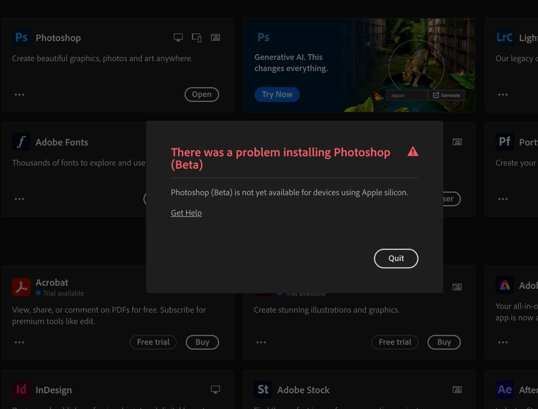 I am gettting this error "Photoshop Beta is not yet available for devices using Apple silicon" when I try to install the PS Beta and Premier Beta apps. Is there a work around for this? Thanks!