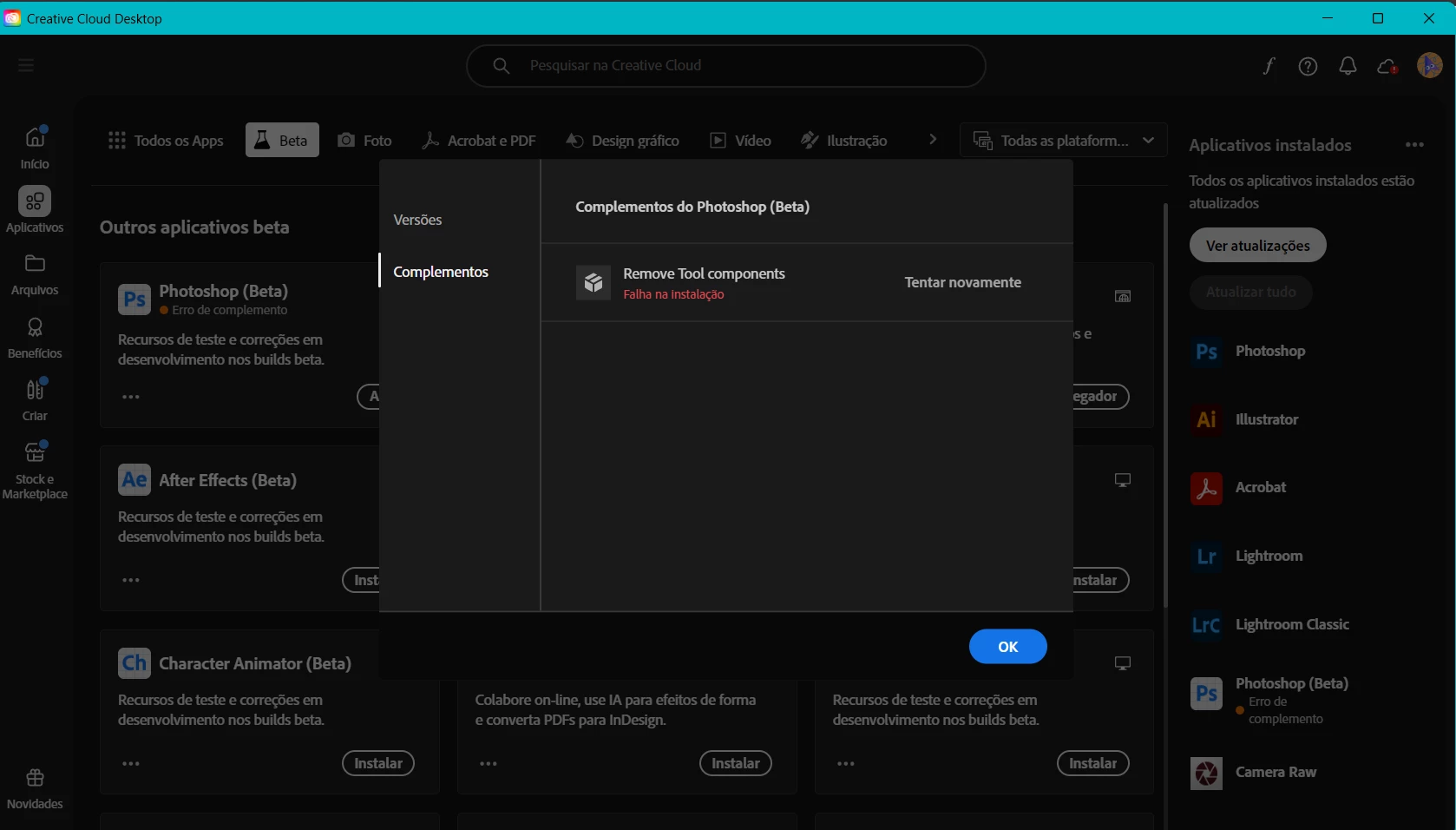 Ao tentar baixar o photoshop beta toda vez que terminava de baixar dava erro, depois conseguiu avançar um pouco mas agora aparece esso erro também . Já tentei outras versões mas acontece o mesmo!