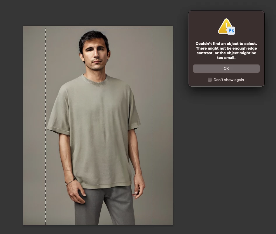 The Photoshop Beta Object Selection Tool is not working. I've selected the object, but there's a window that looks like the attached pictures. Please help.