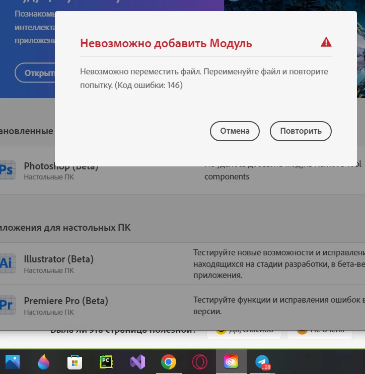 I just delete the application file that got error in my case it was Photoshop Beta, after that I go back to Creative Cloud and install the addons I want and it worked