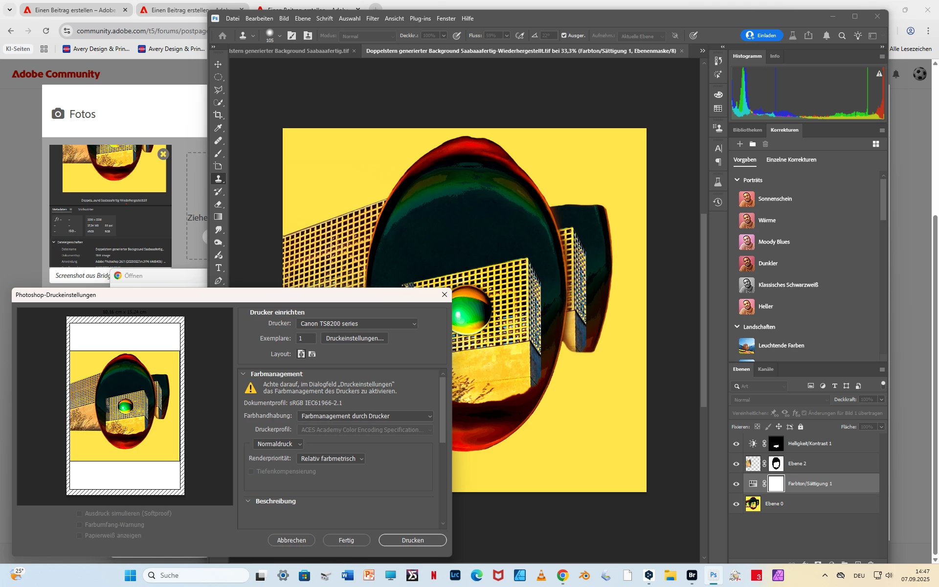 Am 1. September stürzte Photoshop Beta nach der Fertigstellung des beigefügten Screenshots ab und wurde nach einem Neustart wiederhergestellt. Seitdem kann ich weder aus Photoshop Beta noch aus Photoshop 2025 Bilder drucken.