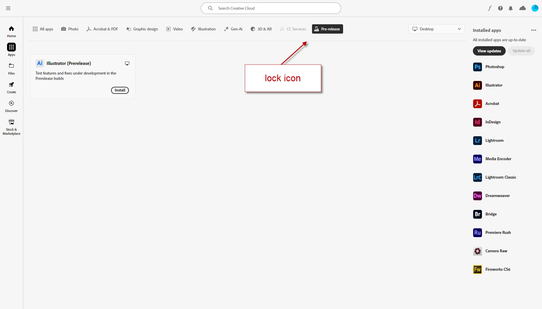 Desktop CC shows a lock over the Pre-release beaker icon, and the only app shown is Illustrator (Pre-Release). Photoshop Beta is not shown.
