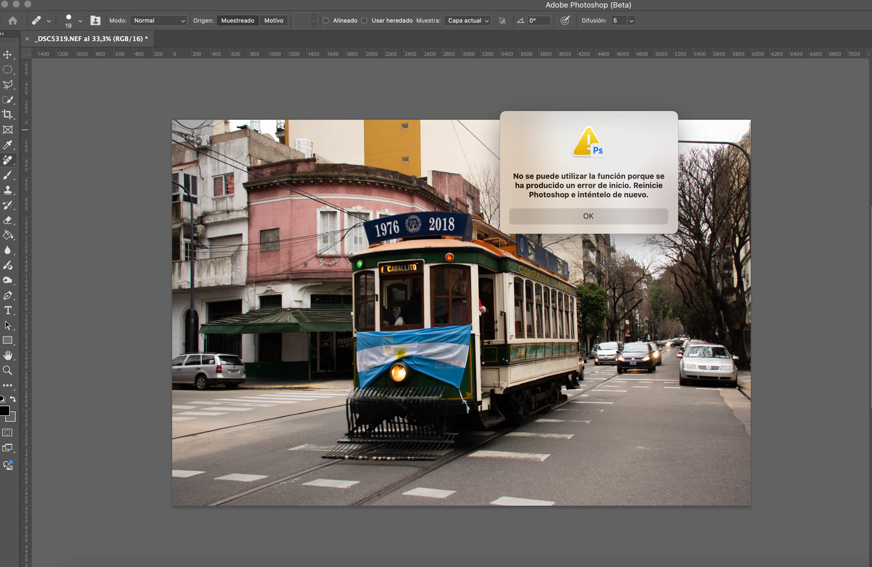 "No se puede utilizar la función porque se ha producido un error de inicio. Reinicie Photoshop e inténtelo de nuevo."