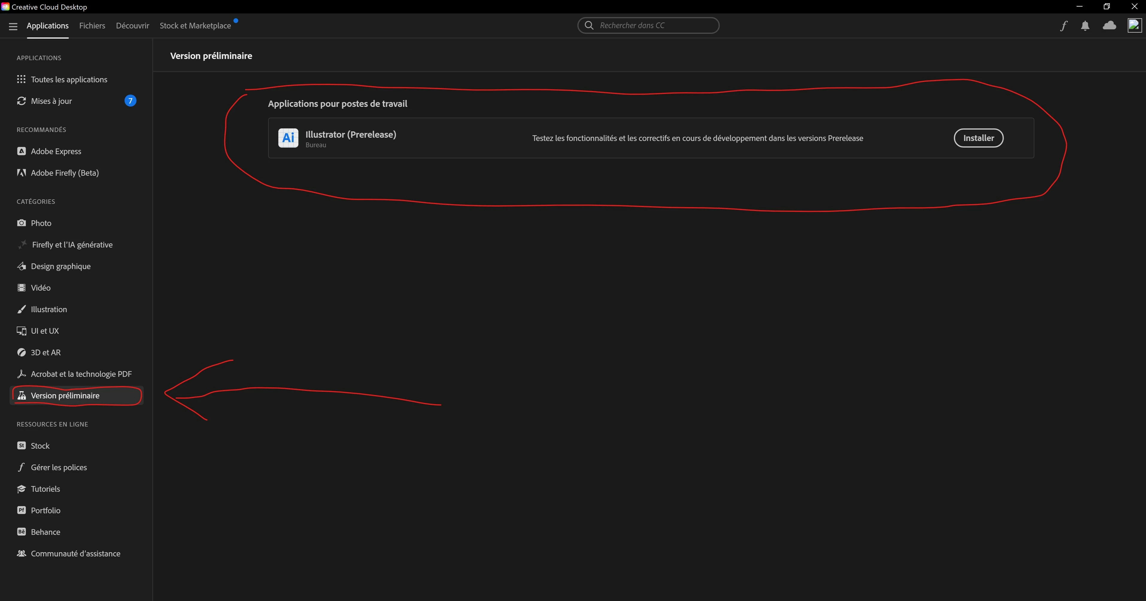Dans l'onglet "Application" dans Créative Cloud, j'ai bien l'onglet "Version préliminaire" mais il n'y a que Illustrator de téléchargeable.