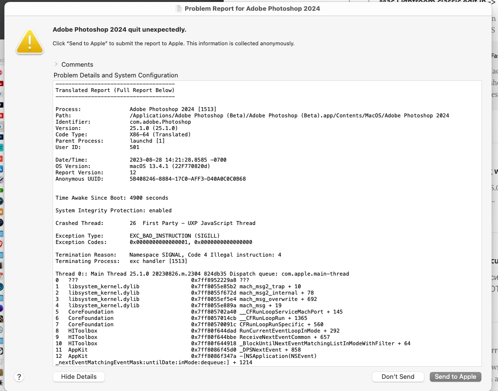 I am new to this forum. My OS is Ventura 13.4.1(c). My Ps(beta) was working fine. Now it doesn't work at all. The regular version of Ps still works fine. I have reinstalled the latest version of the Ps (beta). I have tried moving the Ps(beta) preferences file and letting the software generate a new one. This didn't fix the issue. The program loads and two seconds later it crashes. Can anyone help me with this? Thank you.