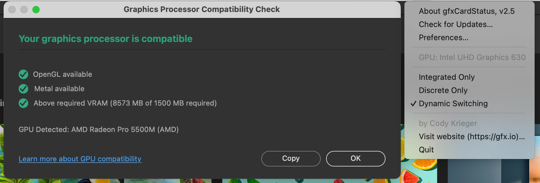 Issue: It says Radeon 5500M graphics is not turning on, (only UHD Graphics 630) while Photoshop 2024 version works fine with that.