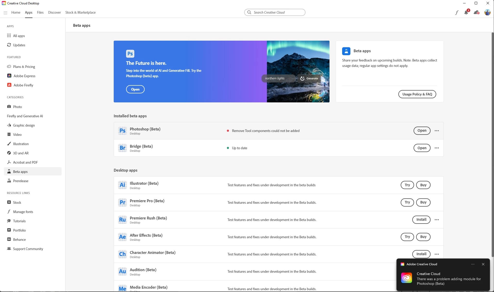 I wanted to share some feedback and issues I've encountered while using Adobe Photoshop Beta Version 25.1. Specifically, I've experienced problems with updating the app and issues related to the remove tool components not being added correctly.