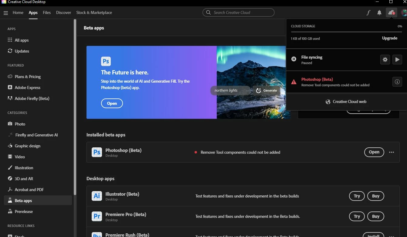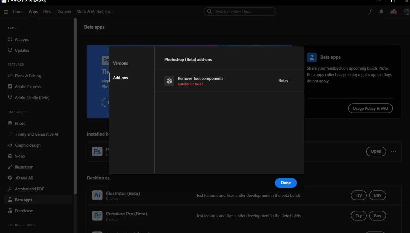 I downloaded the photoshop beta version 25.1 and I tried several times to download the remove tool components but it ends up with error massage (remove tool components could not be added ). I uninstall photoshop beta and reinstall it again, I sign out of creative cloud and sign in again in both tries still the same error. My OS is windows 10 22h2 OS build 19045.3324 windows pro. I have already contacted an adobe agent before and he or she told me to restart and try again, also uninstall the creative cloud with the cloud removal and install it again fresh install, I did it and still I am getting the same error. Can you please tell me how to solve the issue?