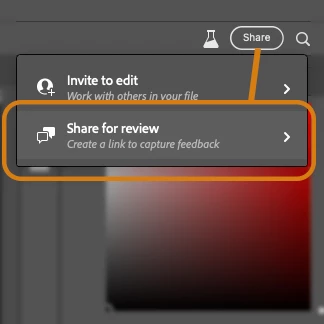 To try Share for Review, use the Share button in the upper-right corner of Photoshop, and choose Share for review.
