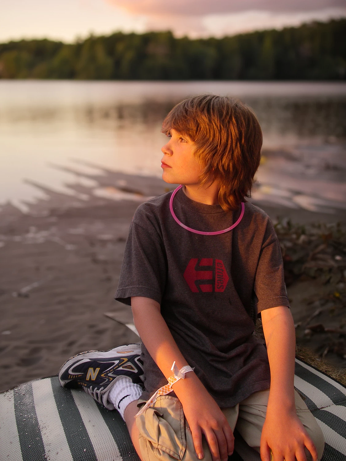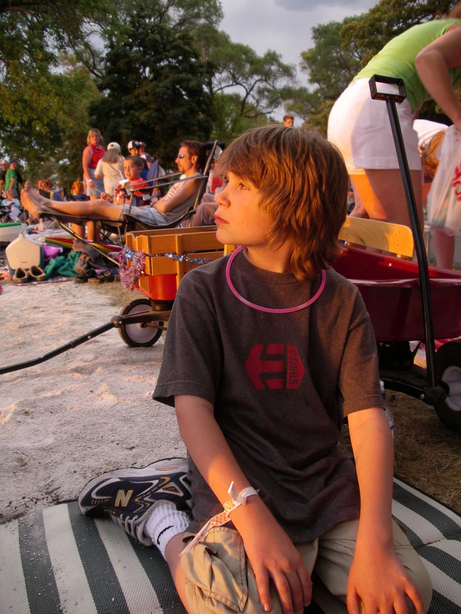 My son looked so cute and pensive in this picture from 2005, but the background was busy and annoying. I cycled through a few options and got this result using "sand and lake with out of focus trees in the background at sunset."