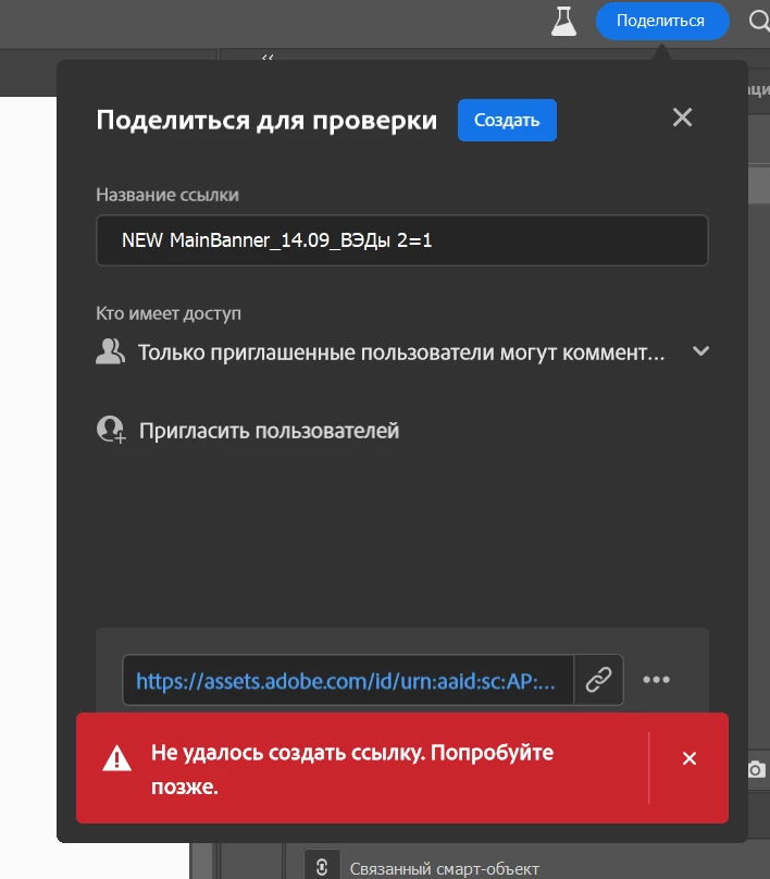 Добрый день! Перестали создаваться ссылки на проект, чтобы можно было поделиться с коллегой. Также, если ссылка создается, то она может не открыться совсем (сначала будет долгая загрузка файла, замтем ошибка. Скорость интернета стабильная и очень высокая) Спасибо!