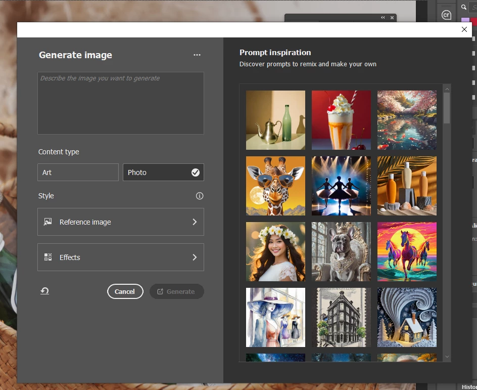 I want to create a generative fill in the area I want in Photoshop, but I can't find a tab to put the reference image. It's frustrating.