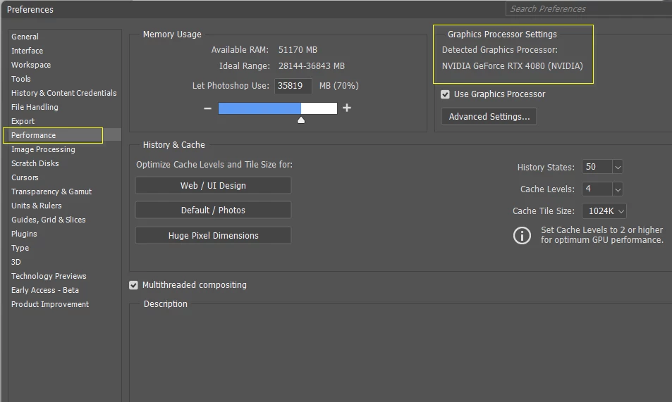 Für Photoshop verfügbarer Arbeitsspeicher: 24836 MB