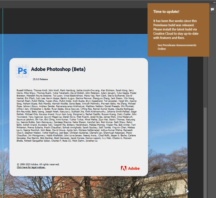 Photoshop beta was updated to the current latest version 25 yet it still shows that "it's time to update".