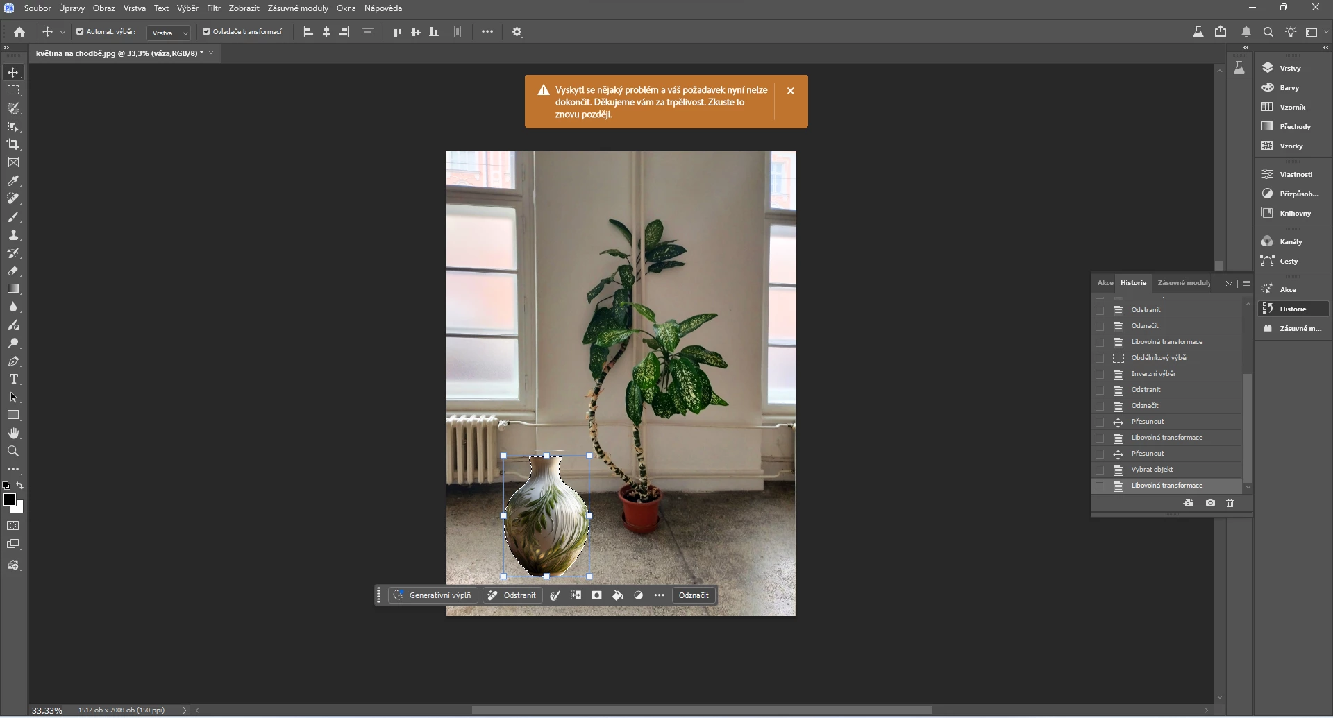 V aplikaci Photoshop Beta nefunguje funkce "Otočit objekt". Zprvu se zdá, že nástroj analyzuje objekt k otočení, pak se zdá, že se objekt už chystá připravit k otočení, když najednou vyskočí okno "Vyskytl se nějaký problém...".