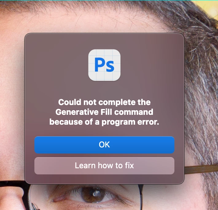Whenever using a popup or through the menu, the generative fill option is available but when trying to use receive a program error. I am working on a work computer iMac Pro 2017 with the below specifications.