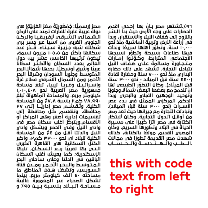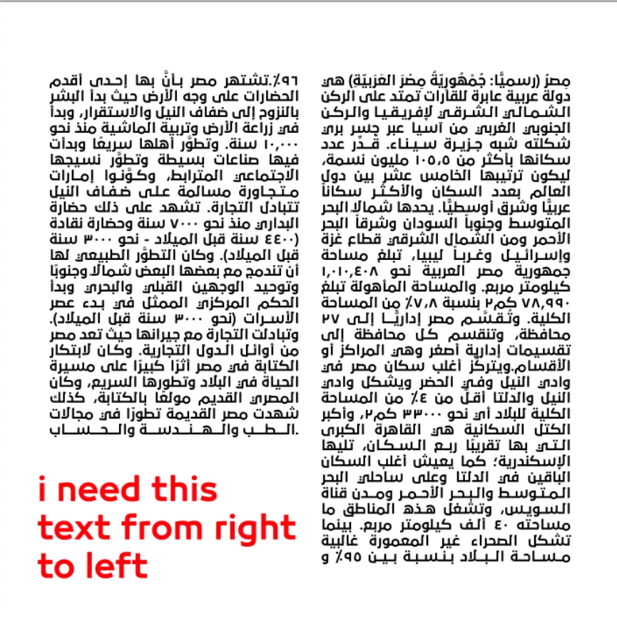 But the project I am working on requires me to do the opposite, which is to create and distribute texts from right to left. I have tried a lot to modify this code to help me, but I have failed.