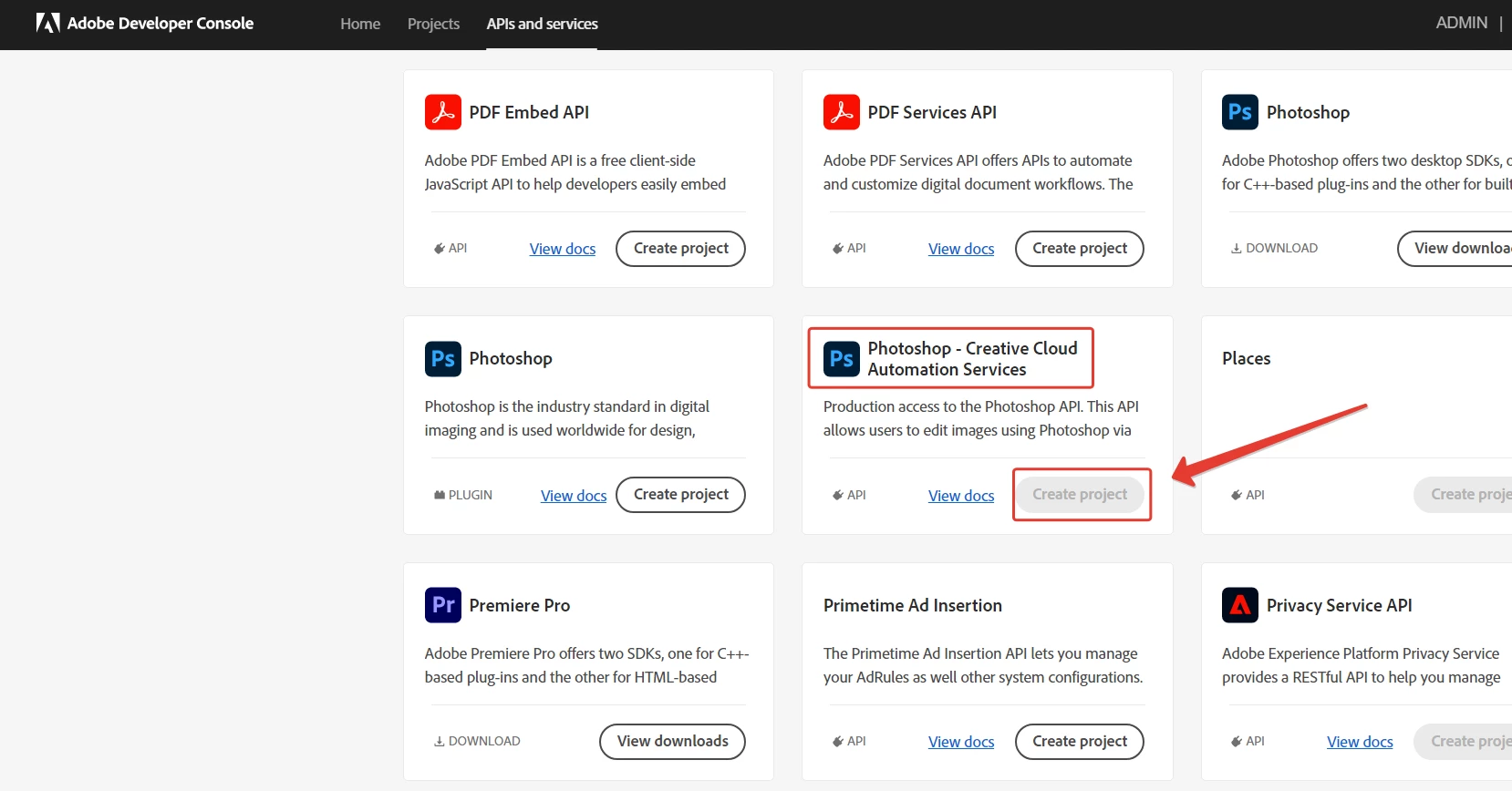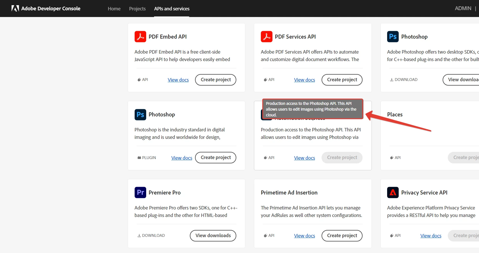 I need to use the Photoshop API to run image processing, applying presets to photos. but in the developer console I can't connect this service, it is highlighted with a gray button. why?