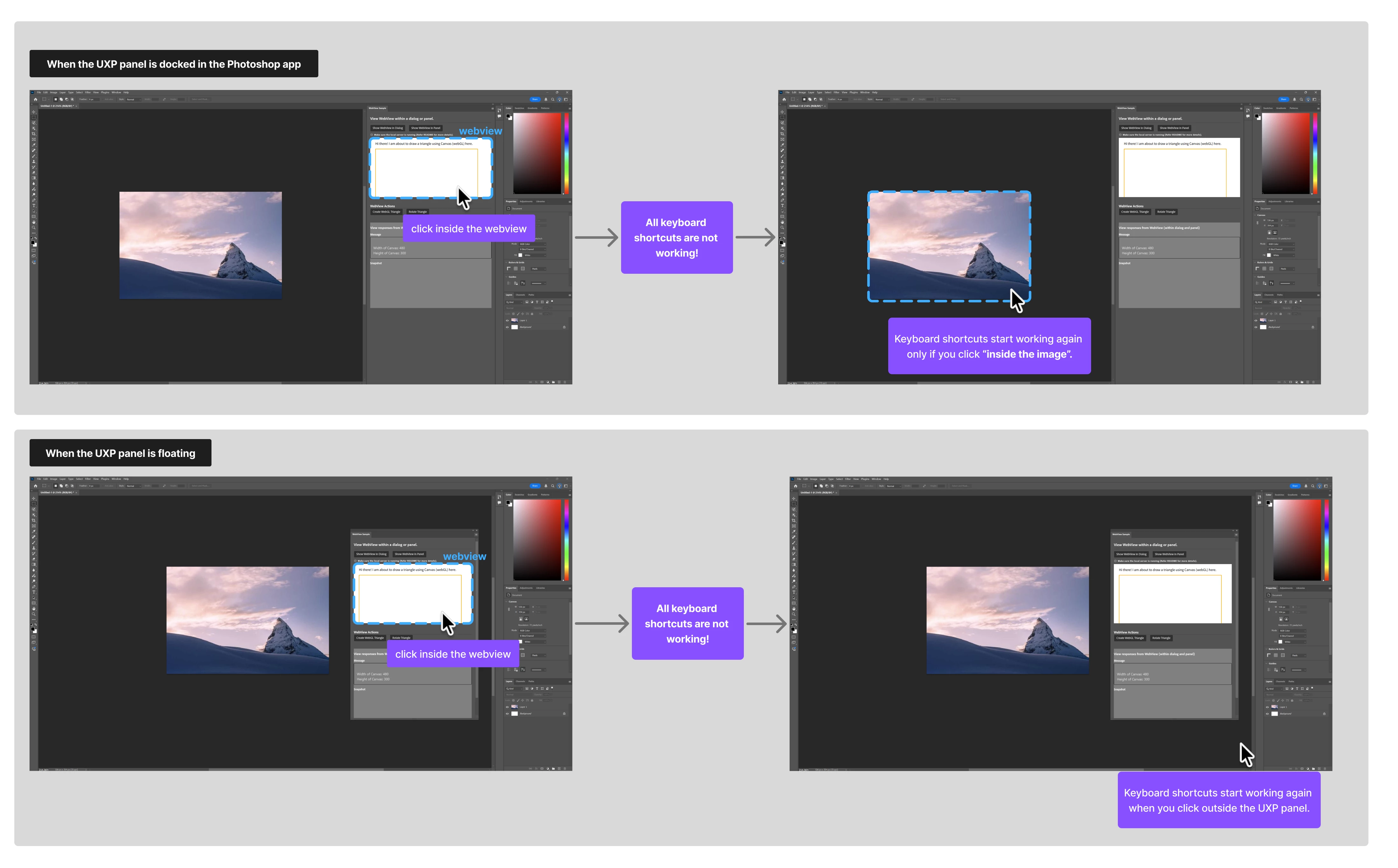 On Windows OS, when the webview is clicked, all keyboard shortcuts stop working. This issue is not fixed even if I click outside the UXP panel. The shortcuts only start working again if I click inside the document’s image. On macOS, this problem does not occur.