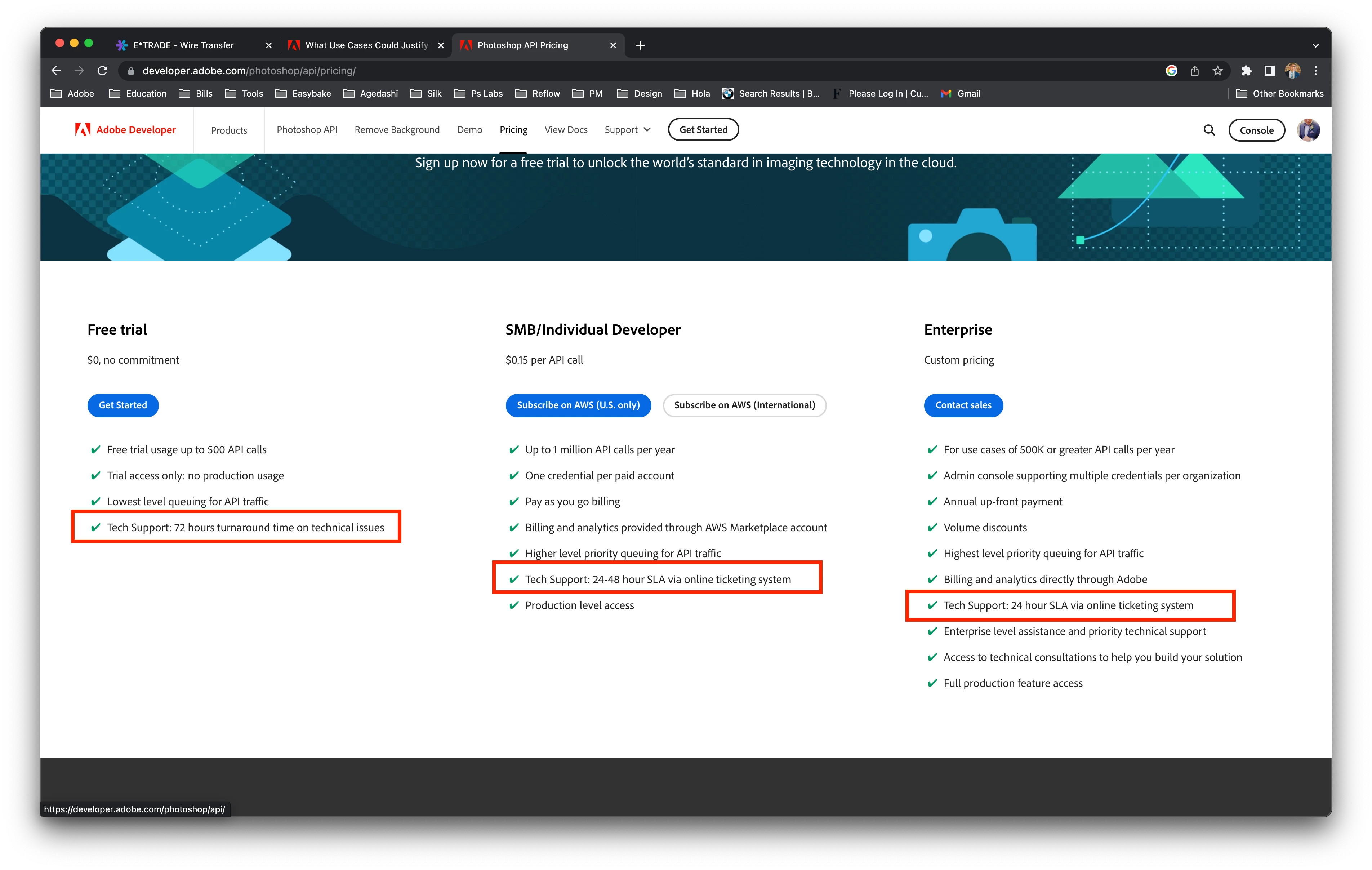 Take the current subscription price for Photoshop (202x). Currently, the prices for a year's subscription for all products (PS, AI, Lr, etc.) round up to ~ $700, $240 for Photoshop alone. Given the cost per successful API call of 15 cents, that translates to approximately 6 API calls per dollar. Since it's a server-to-server-based API, you have to absorb the cost yourself and allocate it to your customers.