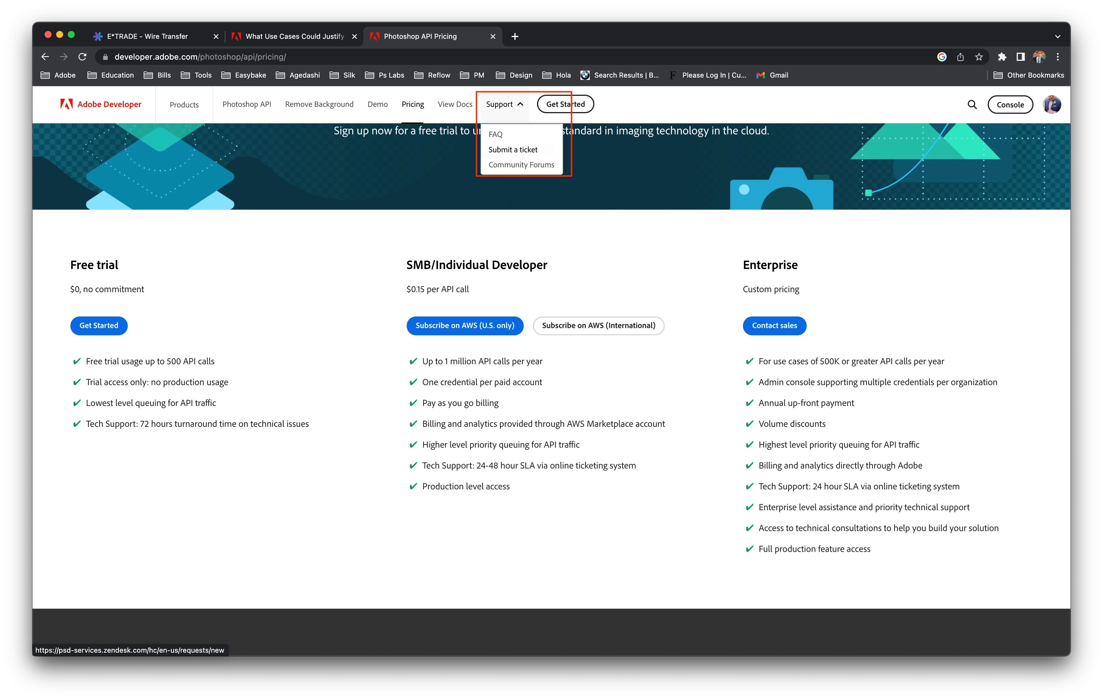 We offer three tiers of support, which give you access directly to the product team and engineers who built the API. You do not need to go through AWS, Adobe is here to support you every step of the way. You can file a support request by going to our site and clicking on "Support" and selecting the option to "Submit a ticket." I'll share the link here also:
