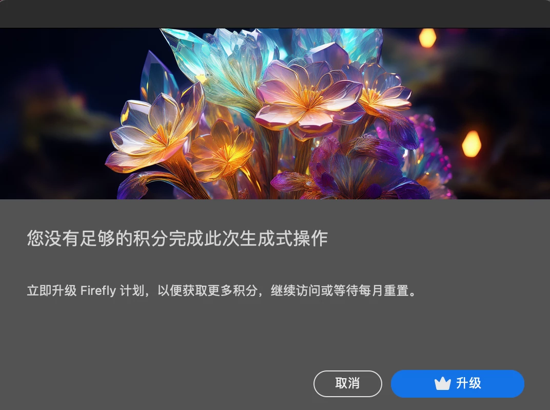 您没有足够的积分来执行此生成式操作。立即升级您的 Firefly 计划,获得更多积分以继续访问,或是等到下个月积分重置后再继续使用。