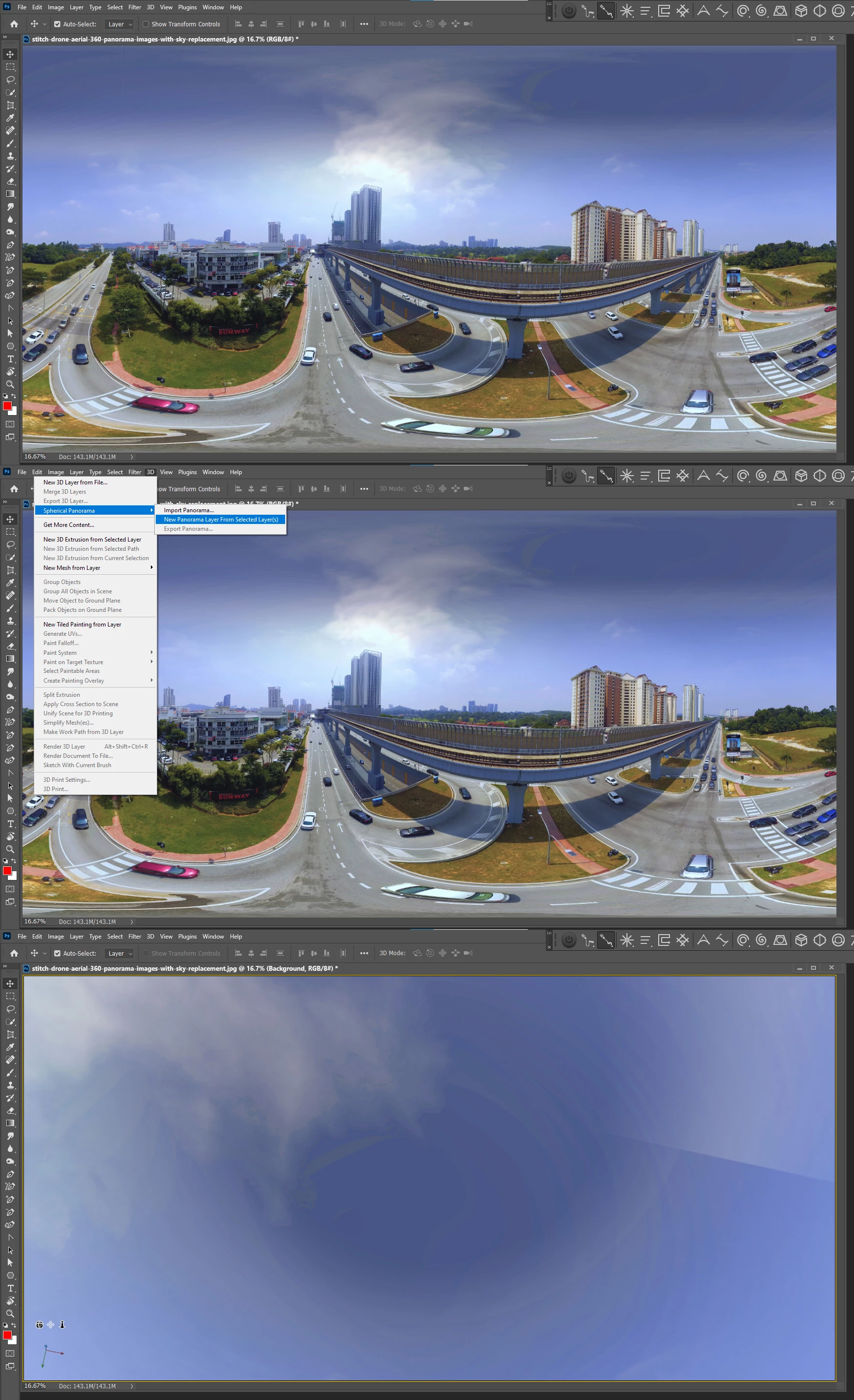 You need software the can create a spherical 366 projection panorama image from what your drone captures. There will most likely be an issue in the 360 spherical project unless you can flip the drone so the area block from view by the drone's body. You can most likely can patch in the missing content in the panorama image using Photoshop 3D spherical 360 panorama Support.