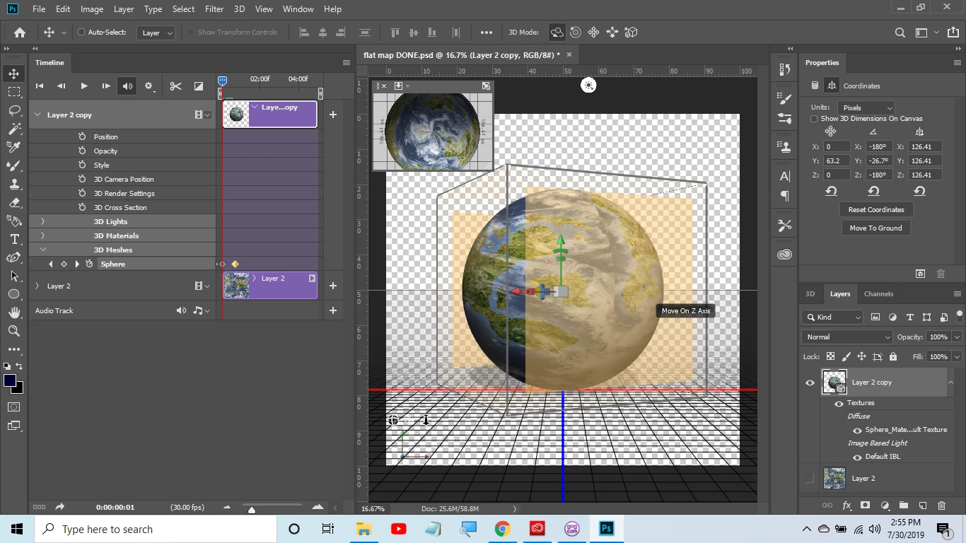 Hello. I am new to Photoshop and very new to 3D and video timeline. I am simply trying to make a planet I made spin. I have watched tons of youtube videos and read a bunch of google posts and nothing seems to work except one I found saying to use 3D mesh. I used the stop watch at the 1st position then moved the time over to 1 sec then rotated the planet on the Y axis then clicked the stop watch again. This worked except that it is super super choppy/laggy yet in the video I watched it was smooth. Thanks in advance for any help. Gary