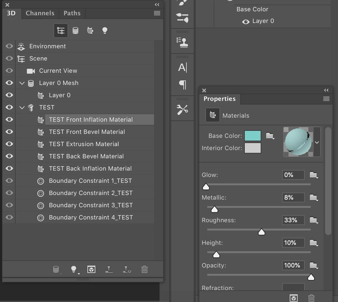 Working in 3D space in Photoshop CC 2020 and I can't understand how the palettes for materials changed. All tutorials I can find online have something on the top that says 'Diffuse' I only have 'Base' and 'Interior'