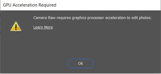 I have Windows 10 and Photoshop has been working fine until i loaded latest version november 2023. When i try to open the Camera RAW filter says: Camera Raw requires graphics processor acceleration to edit photos.   Graphics Processors Compatibility Check  says "OpenCL  and DirectX is unvailable"  ?