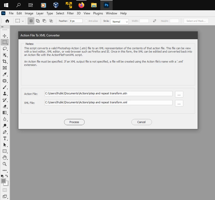 I am trying to convert a photoshop action to a script so I can replace the filename in save steps with the variable for the current photoshop document but I cannot seem to convert my ATN file to an XML file in order to code this.
