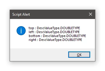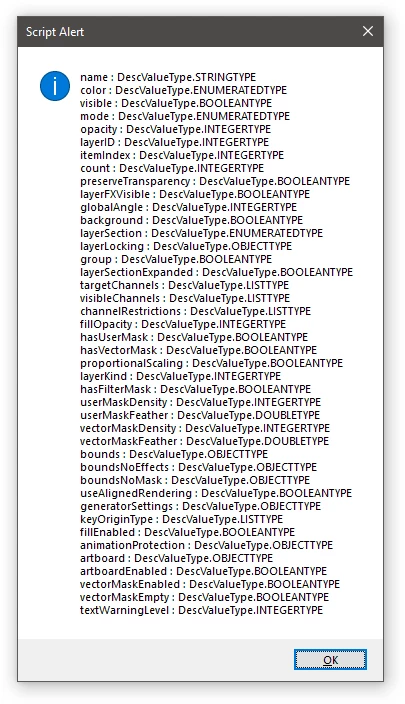 Further, knowing the name and type of the property, we can get its value using one of the functions from the Photoshop JavaScript Reference Guide.