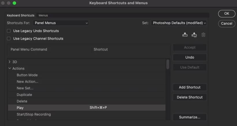 I assigned the shortcut via Edit > Keyboard Shortcuts and the respective Panel Menus entry.