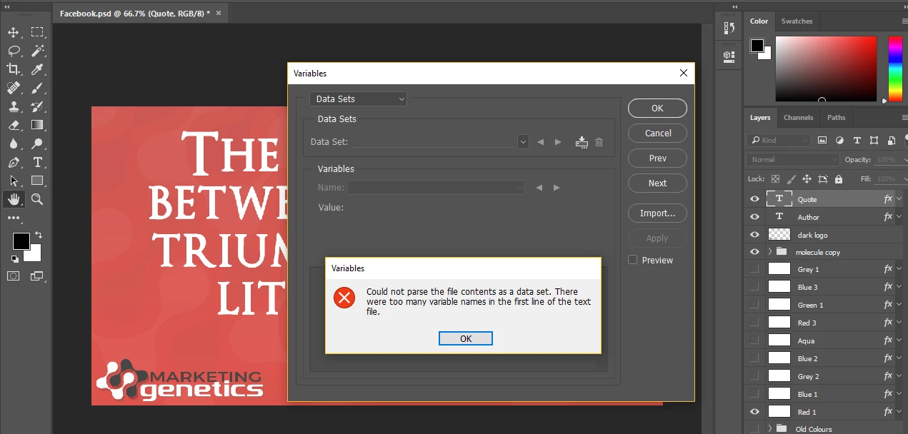 I have a PSD template where I just paste in the quote and author name and save for web, but this is obviously a boring job. Is there any way to automate this process via action or scripting?