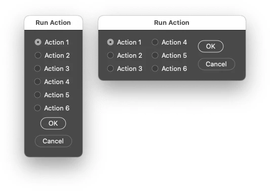 A mockup of a basic interface, which could either reference installed actions by set/name or the action could be converted to script code so that the script is self contained without relying on an action set being loaded: