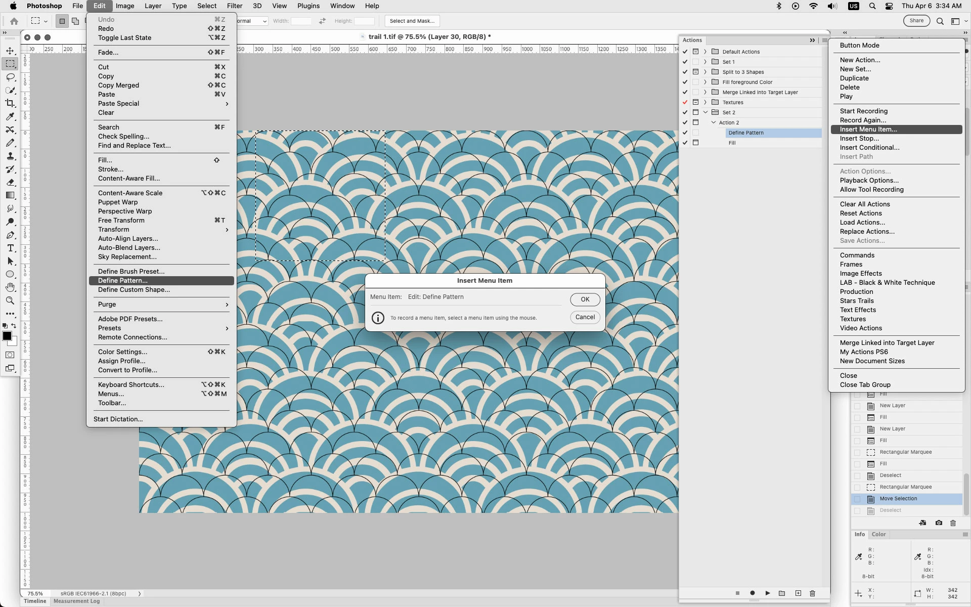 Hi there, I have created an action that takes a photoshop file, selects it then defines it as a pattern. Then the action proceeds to open a number of photoshop files and applies the pattern to the file. The problem I'm having is it isn't necessarily taking the latest generated pattern. Is there a way to do this? Where when it goes to apply the pattern on the new files just opened it uses the one I just created in the first step?