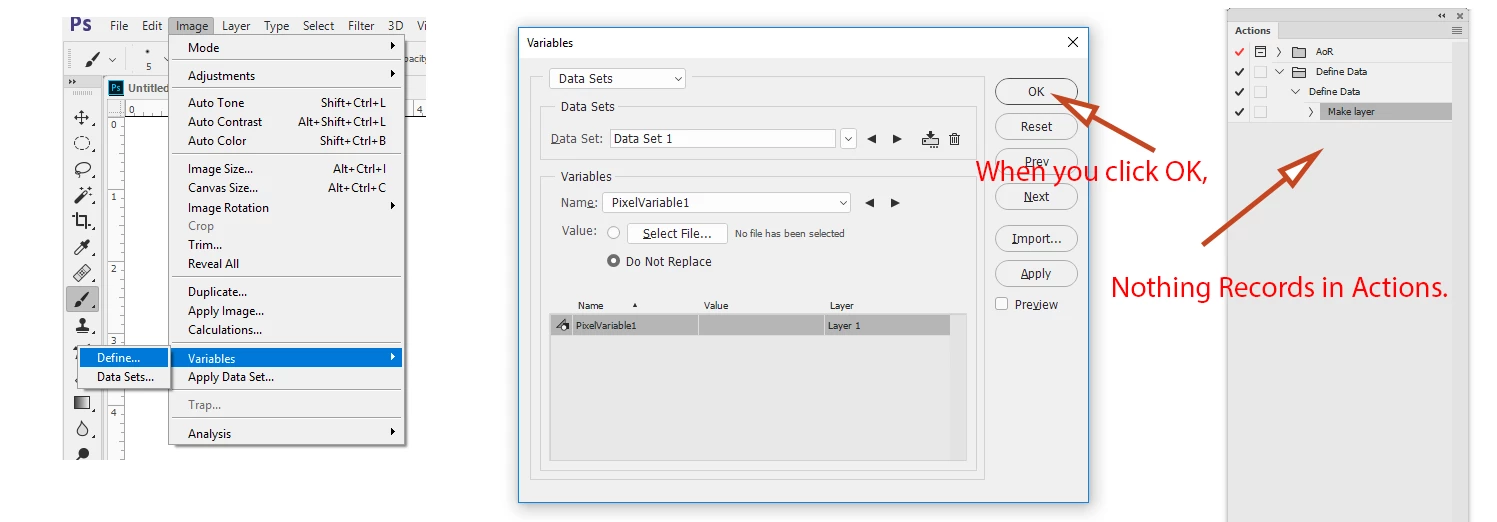 Photoshop Bug? How can I use Actions to Apply a Data Set, if I can't use Actions to Define the Data Set?