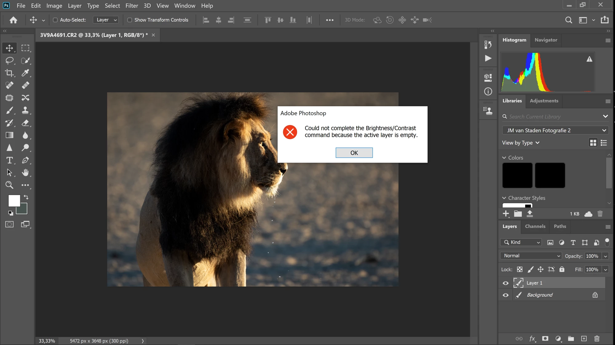 When I import a photo, it says "Background" in the Layers panel, but the photo picture doesn't show there, only the Brush Tool's picture. When I create a layer, I get a message "active layer is empty". How do I fix it, please?