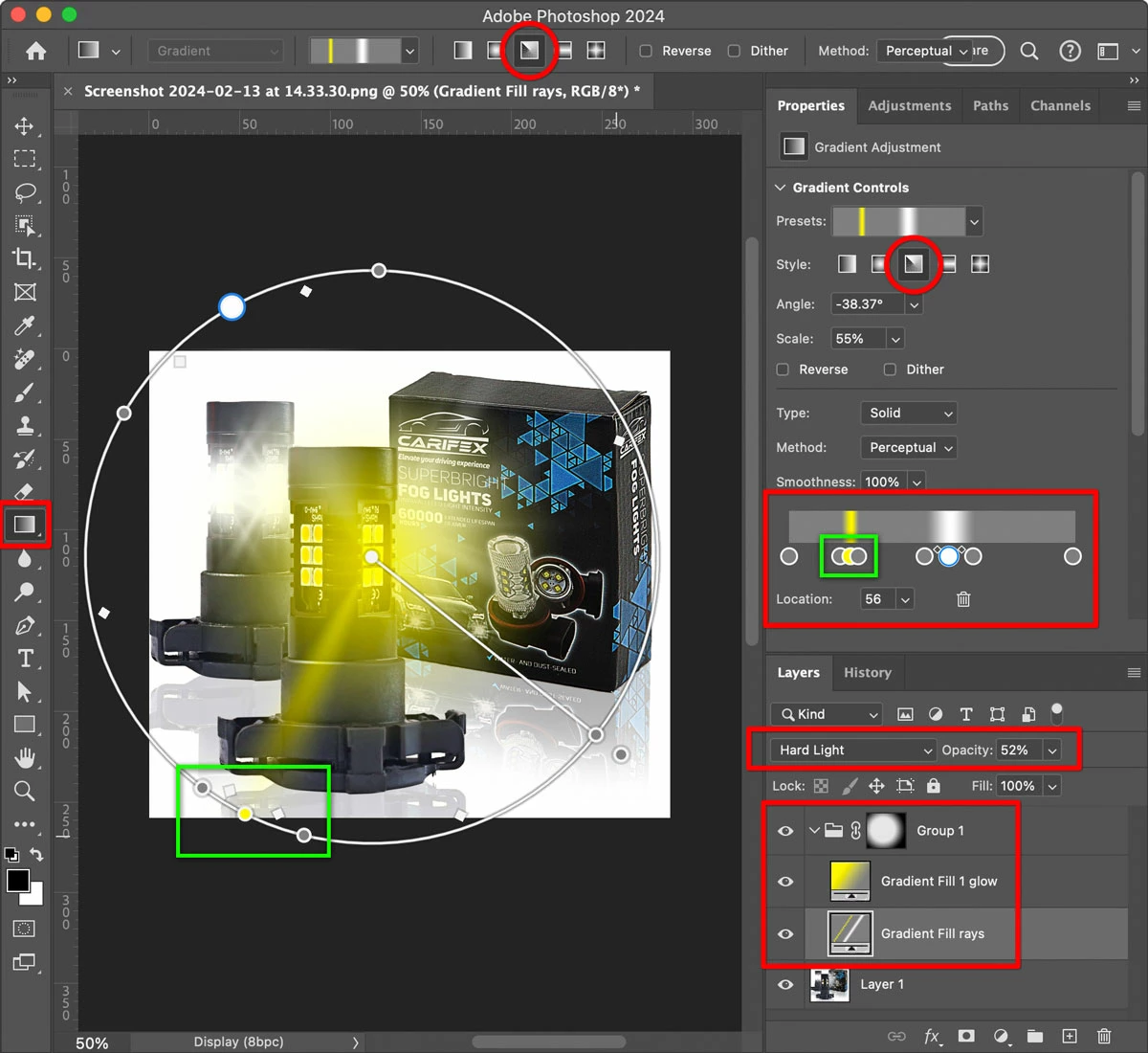 I have isolated the right fog light and want to add a lighting effect to it.